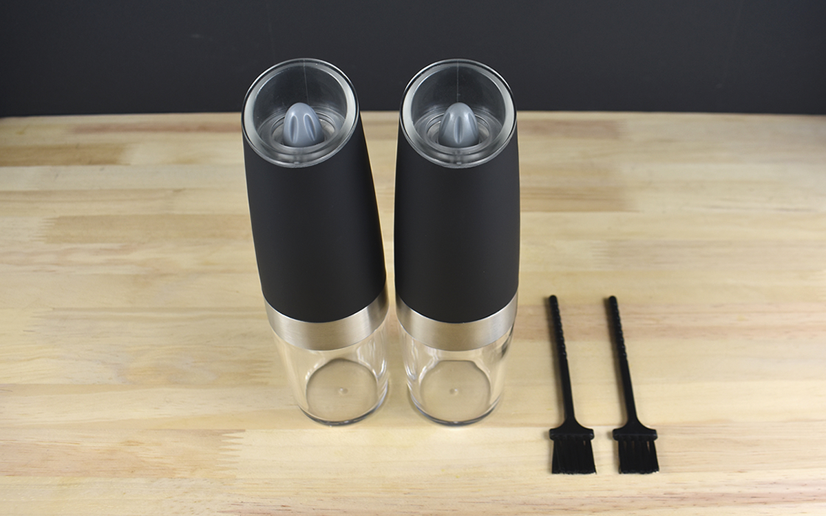 透明パーツに胡椒を入れて使用してみたところ、手に持って傾けただけで本体が稼働。細かく挽かれた状態で皿に注ぐことができました。また、稼働時に灯る先端のLEDライトもポイント。手元が照らされ、使用量や粒の細かさが確認しやすくなります。ちなみに胡椒だけに限らず砂糖や海塩などにも使えるので、2本のミルをぜひ活用してみてください。