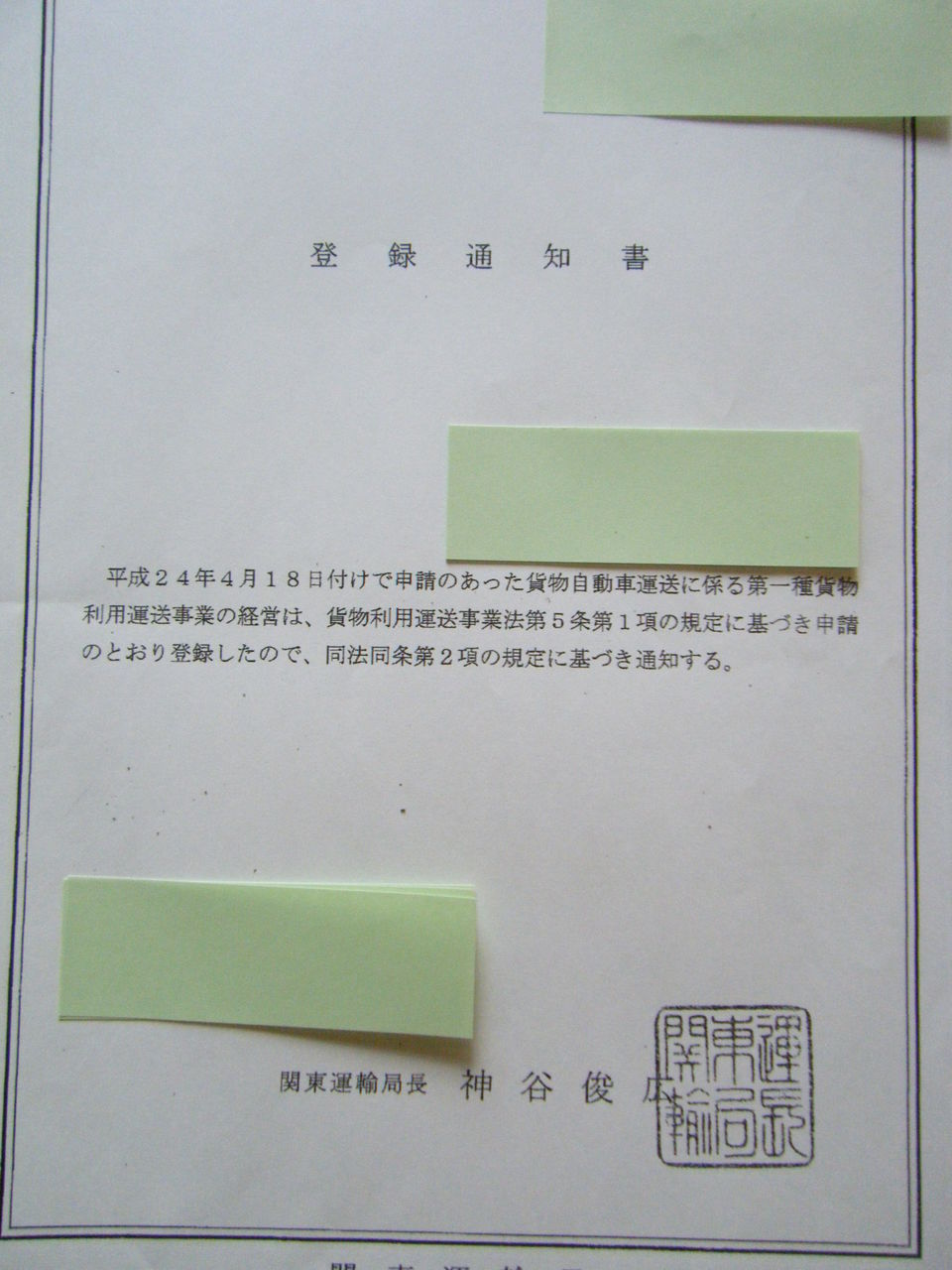 貨物利用運送事業登録通知書がやっと来てくれました。お客様のところにです。これで一つホッとした気分です。どんな許可や登録でも無事終わると嬉しいですね。 常に審査待ちがあるので、この仕事をやっている限りはこのドキドキ感は無くならないんだろうけど。 このような許可申請等に携わったうちのお客さんの売上げが上がってくれればいいね。みなさん、頑張って下さい。