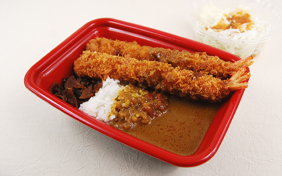 松のやのカレーメニューは昨年リニューアルし、香り豊かでマイルドな味に進化したそうです。なかでも同商品はインパクト抜群の大きな海老フライを2尾トッピングしているのが特徴。テイクアウトで購入するとカレーと海老フライが分けられているため、食べる前にご飯へ盛りつけてからいただきます。