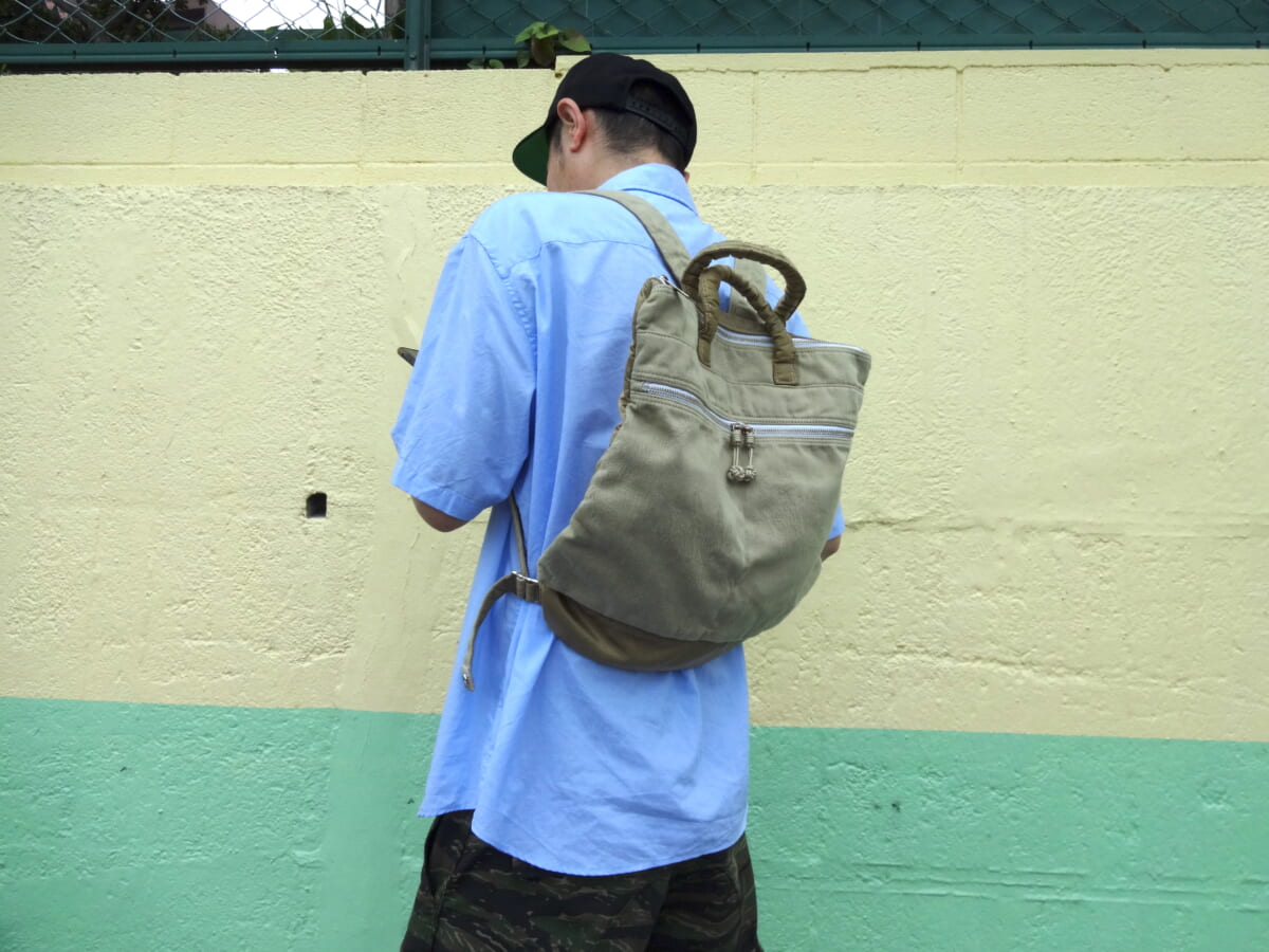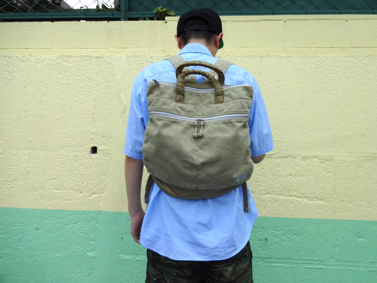 吉田カバンの「PORTER WEAVE(ポーター ウィーヴ)」は、コットンジャカード織り生地とナイロンツイル生地を組み合わせ、さらに製品染めによってコットン部分のみを染めて仕上げたバッグをラインナップしているシリーズです。 そんなポーター ウィーヴシリーズでオススメなのが、手持ちと背負いの2通りの使い方ができる「2WAY HELMETBAG(2ウェイ ヘルメットバッグ)」!