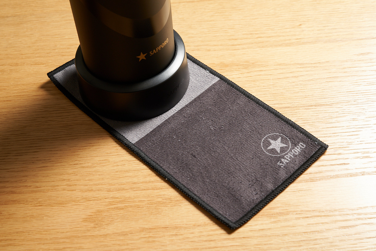 また、チューブ先端からビールの液が垂れても周囲が汚れないよう、専用のマイクロファイバーハーフタオルが付いているのも親切だ。素材は吸水性に優れ、ブラックとグレーのツートンカラーもスタイリッシュ。そばに置いておきたくなること請け合いである。