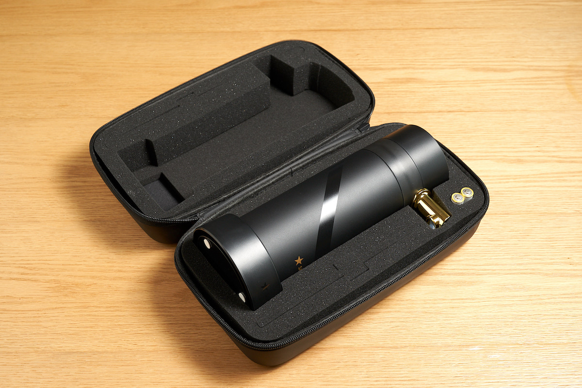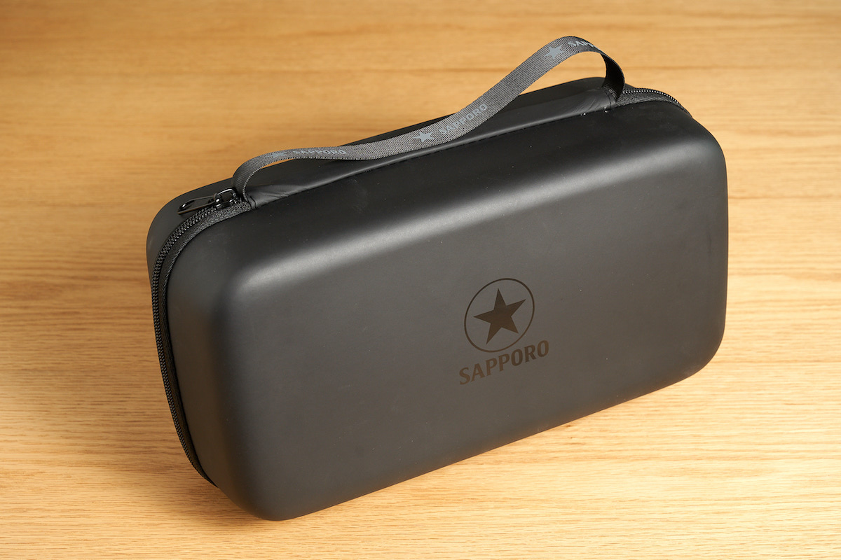 持ち運ぶ際は、本機に付いてくる「専用ケース」を活用したい。マットブラックに、黒ラベルのロゴが黒色で配されたオールブラックのデザインは、非常にクール。内部には専用のスリット入りクッションが配され、本機をしっかりホールド。また、ストラップ付きなので片手でもなんなく取り扱える。もちろん、収納にも大活躍だ。