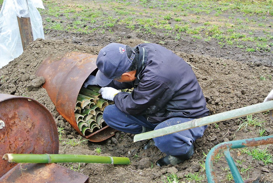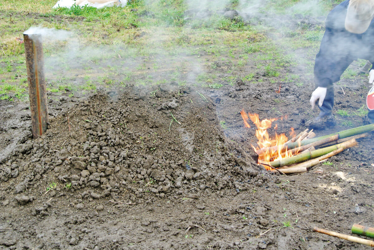 用意するのは、燃料用のドラム缶を改造した手作りの窯と竹材(伐採してから2〜3カ月経ったものがベスト。真竹を使用)。あとはシャベル、それに煙突の中の温度を測る温度計があるといい。