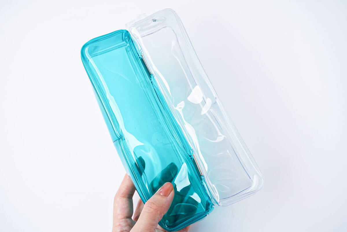 一方、色のないクリアなケースは、ファスナーがきちんと側面まで来ているのもポイントです。こうなっていると口が大きく開くので、中身を取り出しやすいのです。コストダウンのためにファスナーが短いペンケースも少なくないので、ここは要チェックです。