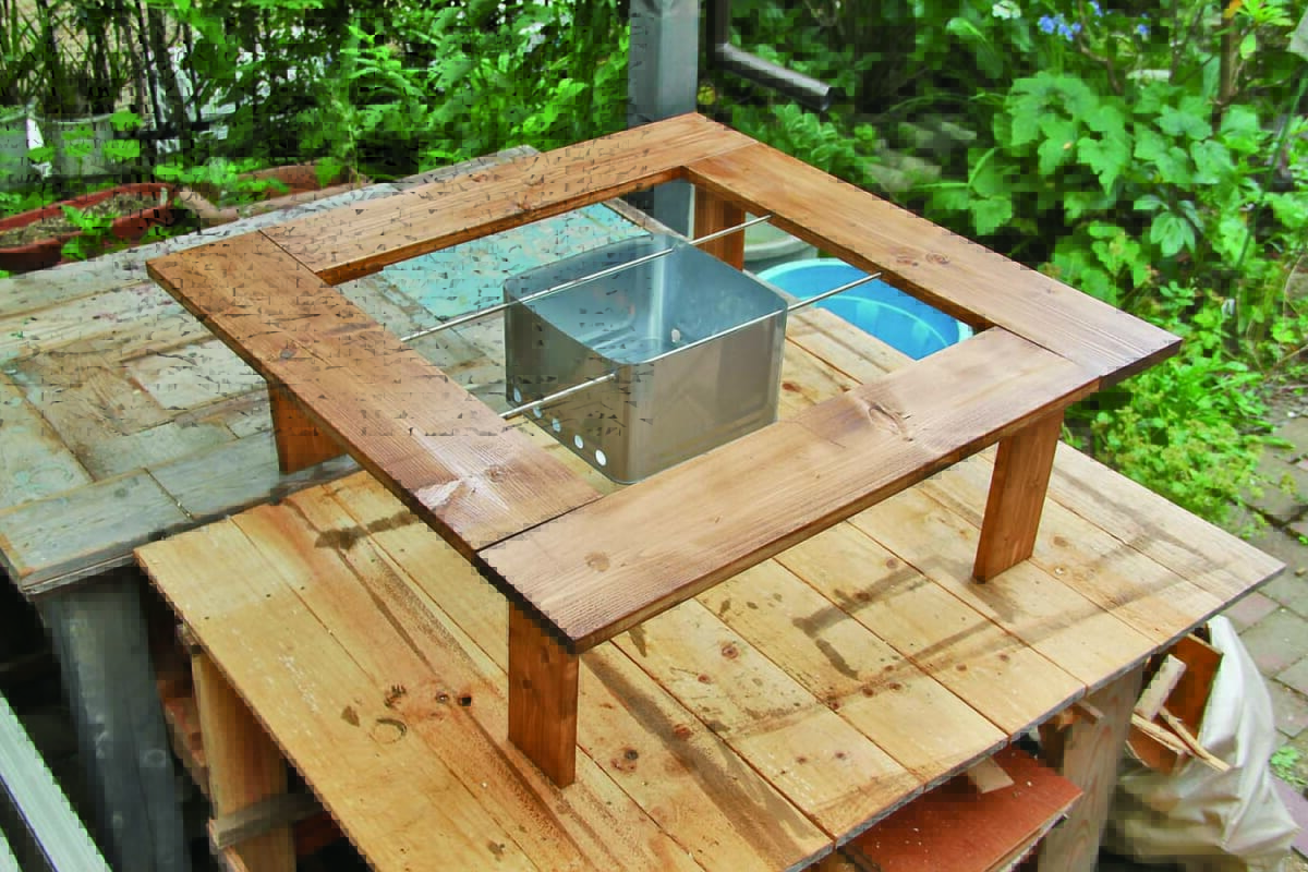 自分なりのアイデアで、オリジナル焚き火アイテム作りに挑戦してみよう。編集部が構想したのは、焚き火台とテーブルが一体になった焚き火テーブル。身近な資材を使って、できるだけ簡単に作るのがコンセプトだ。