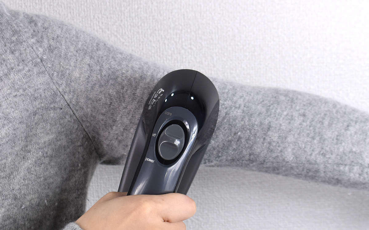 カットする時のモードは2つあり、スイッチで簡単に切り替えが可能。通常時は「power」、おしゃれ着や着衣状態で毛玉をカットする時は「care」を選択してください。