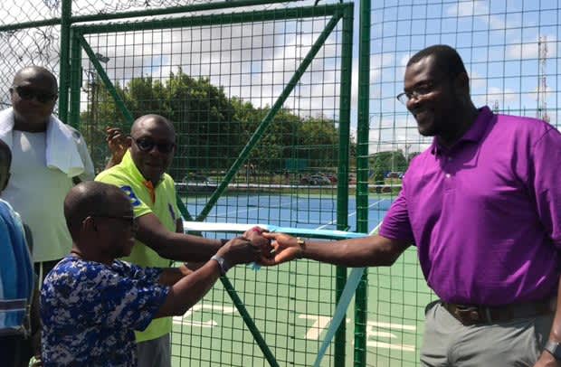 Chairman of the Atomic Club, Steiner Wood (2nd L) with ITF referee Yakubu Lea presenting the keys of the court to TGF President Roger Crawford ®