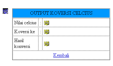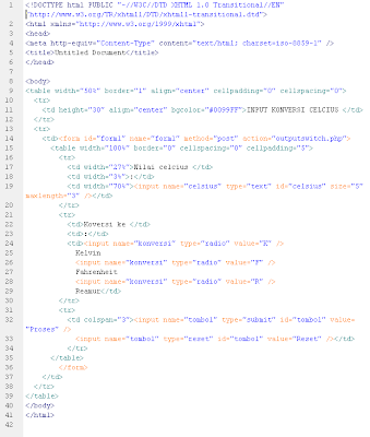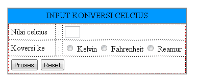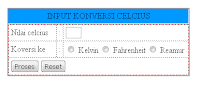 perhitungan konversi suhu. Dimana alur ceritanya, kita memasukan nilai celcius dan memilih konversi (reamur, fahrenheit atau kelvin) dan klik proses maka akan muncul hasil perhitungannya. Tanpa panjang lebar lagi kita mulai aja “