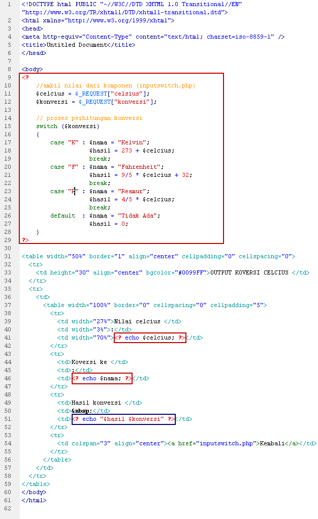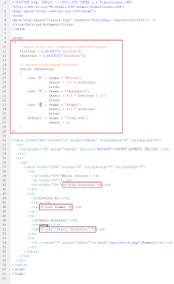 Keterangan : klik gambar untuk memperbesar gambar. Souce code yang dikotak merah merupakan code php nya. Untuk kotak merah yang besar merupakan pendeklarasian dari variabel dan percabangan switch nya.