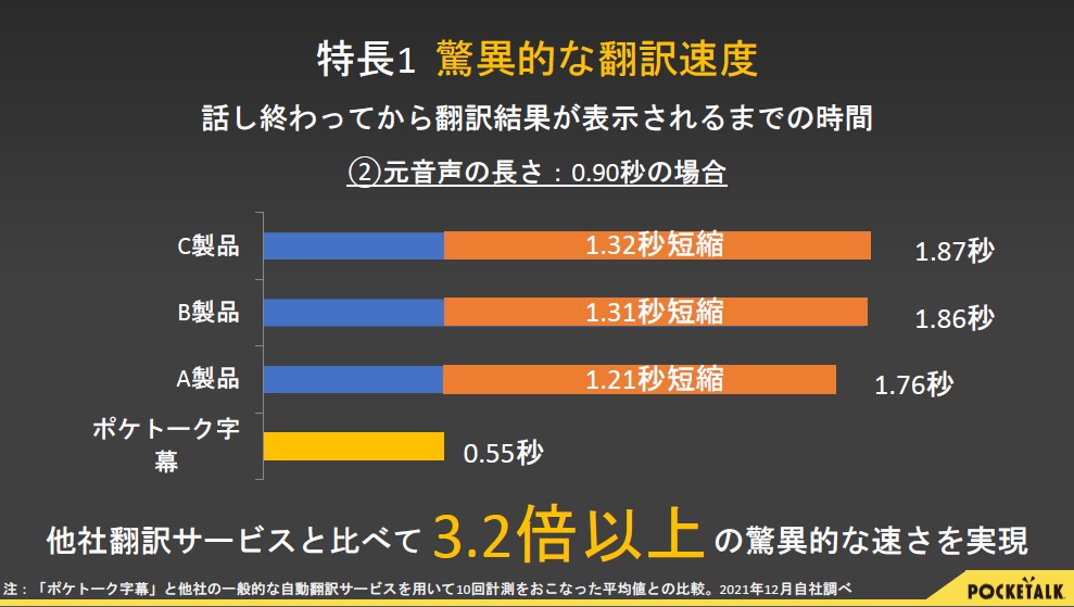 最大の特徴はその速さ。翻訳結果が表示されるまでの時間が短く、同社によれば他社の類似サービスと比較して3.2倍以上速いとのこと。これにより、通訳を挟んで会話するよりも軽快でテンポよくコミュニケーションを取ることが可能となっています。