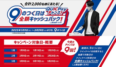 ジェイシービーは9日、同社が提供する非接触IC機能「FeliCa」を用いたタッチ決済「QUICPay」(QUICPay+含む)において合計2000人に全額キャッシュバック(上限金額1万円)するキャンペーン「QUICPayチャンス!9のつく日は全額キャッシュバック」を2022年1月9日(日)から3月29日(火)まで実施するとお知らせしています。