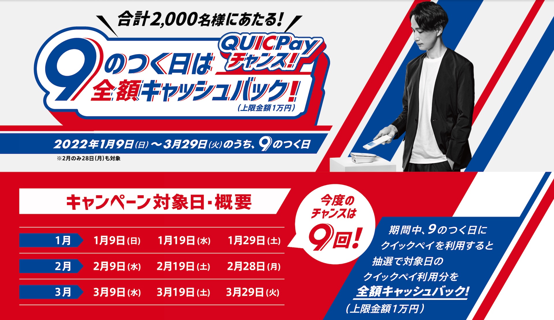 キャンペーン対象日は1月9日(日)および1月19日(水)、1月29日(土)、2月9日(水)、2月19日(土)、2月28日(月)、3月9日(水)、3月19日(土)、3月29日(火)の合計9日。対象の支払方法は「Google Pay」や「Apple Pay」に設定した場合を含むすべてのQUICPay(一部除く)となっています。