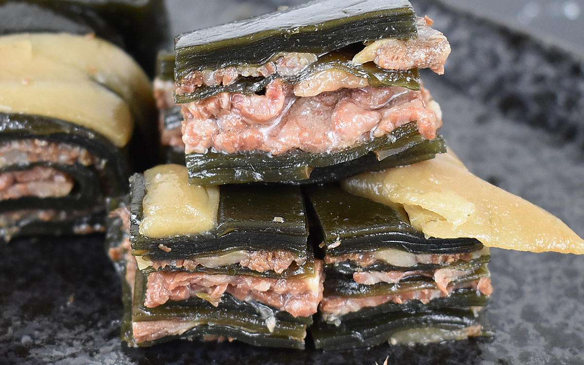 パッケージを開封すると、棒状の昆布巻がお目見え。好みの大きさにスライスすれば、そのまま食べることができますよ。カットしたところ、昆布と牛肉が綺麗に重なった断面に感動。箸で優しく掴まないと崩れてしまうほど柔らかいので注意してくださいね。