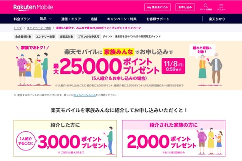 | 楽天モバイルが家族5人紹介で、みんなで最大25,000ポイントプレゼントキャンペーンをスタート! |