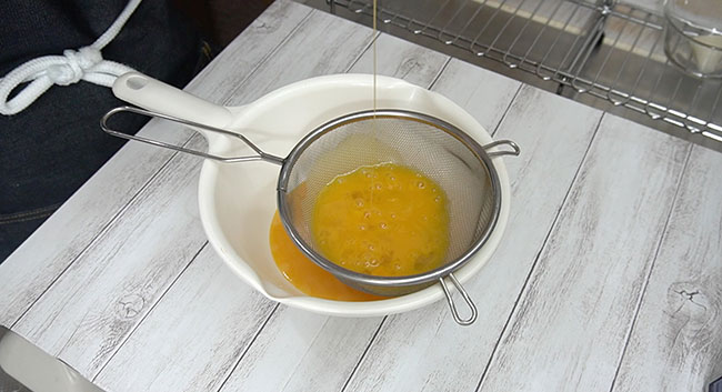 2. 混ぜ合わせた卵液をザルや茶漉しを使い、少しずつ漉していく。