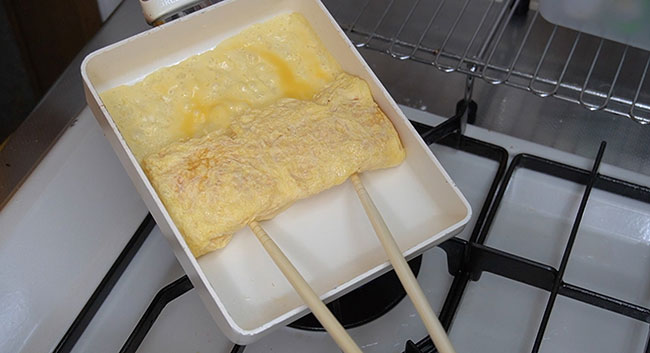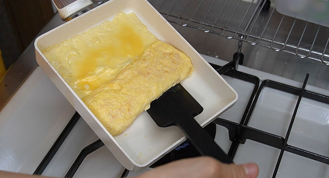 7. 持ち手側を持ち上げ、手前から奥へ卵を返し、卵焼きの「芯」を作る。(多少崩れてもOK!)