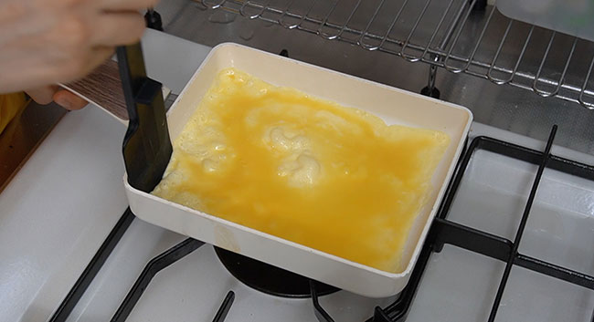 7. フライパンが温まってきたら、全体に卵液が行き渡るくらいの量(卵焼き用フライパンならお玉で約1杯分)を流し入れ、全体に広げる。