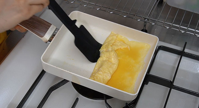 5. 持ち手側を持ち上げ、手前から奥へ卵を返し、卵焼きの「芯」を作る。(多少崩れてもOK)
