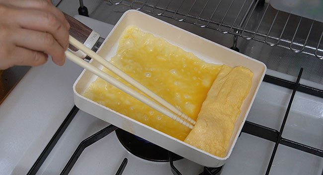 8. 持ち手側を持ち上げ、手前から奥へ卵を返し、卵焼きの「芯」を作る。(多少崩れてもOK)