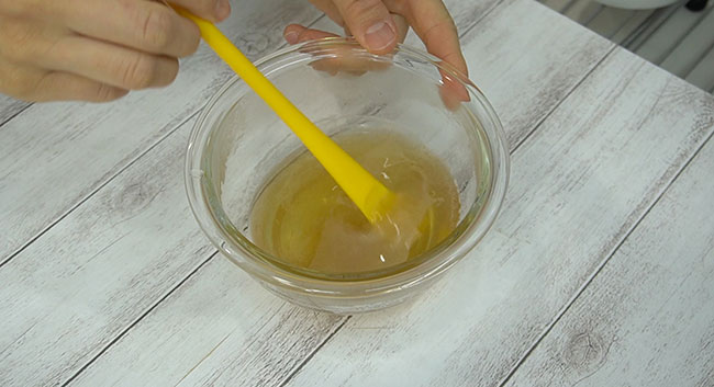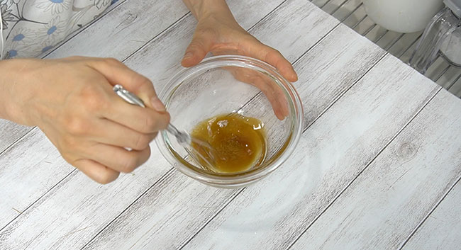 1. 耐熱容器に顆粒のこんぶだしに、醤油、みりん、調理酒を加え混ぜ合わせ、600Wの電子レンジで20秒加熱する。レンジから取り出し、顆粒が残っているようであればしっかり混ぜて溶かしきり、粗熱をとる。