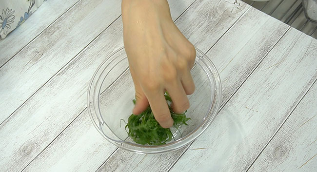 3. ボウルに「2」を入れ、塩小さじ1/2(分量外)と共に20秒ほど塩もみ。10分ほど置いたあと、水洗いし、塩気を取る。