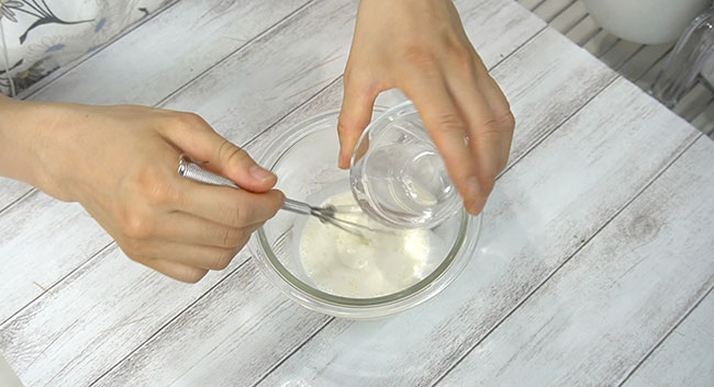 4. ボウルにマヨネーズを入れ、少量ずつ水を加え、ダマがなくなるまで混ぜ合わせる。(マヨスイは、使う卵の数に合わせて調整する)
