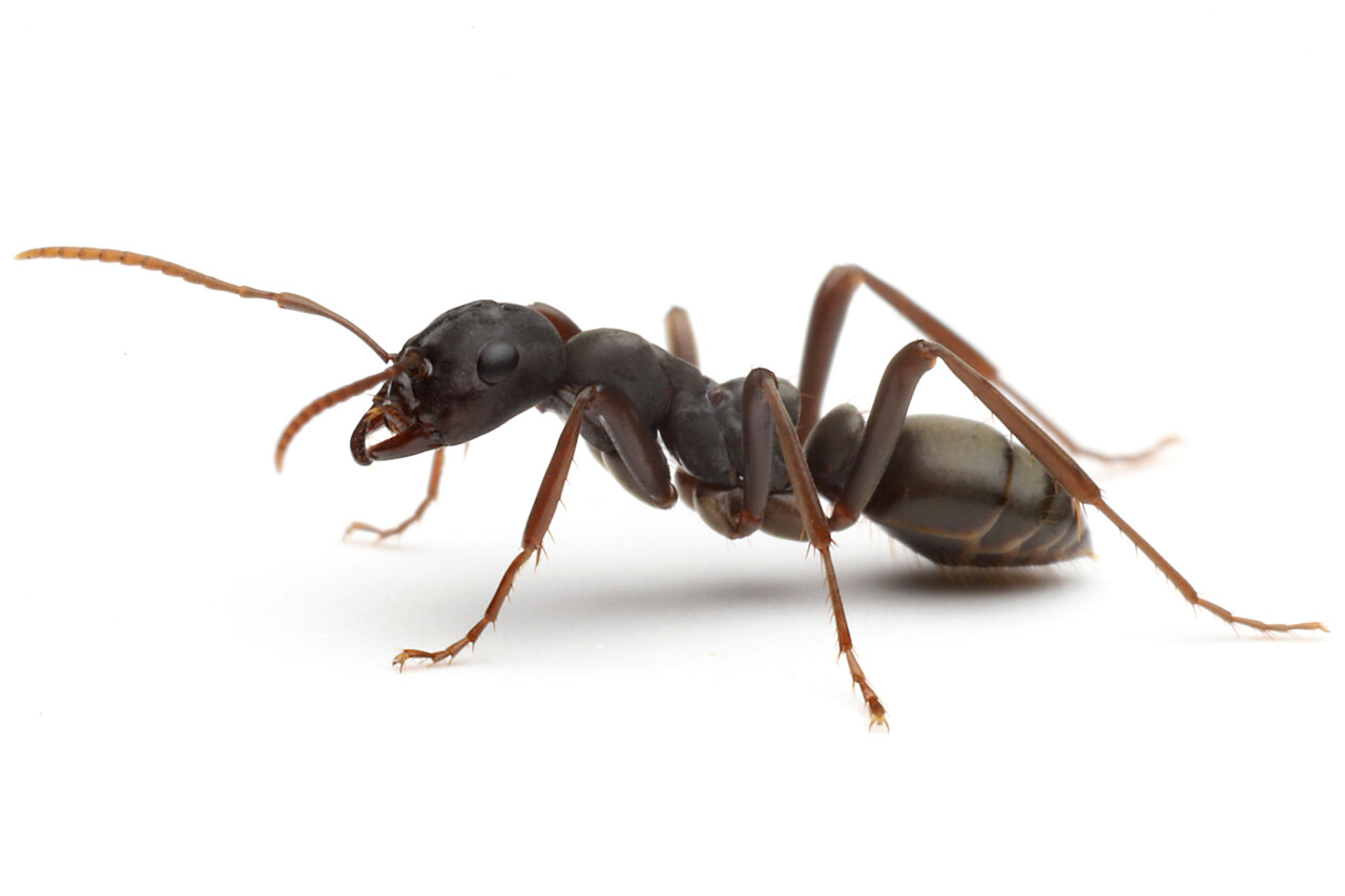 反対側から見ると、触角と脚は黒く、アゴが発達して、翅がありません。