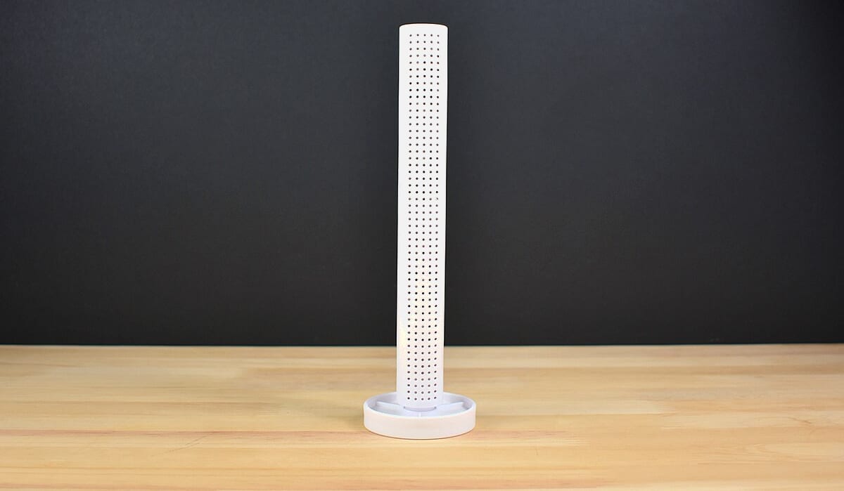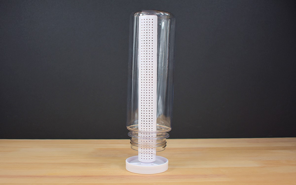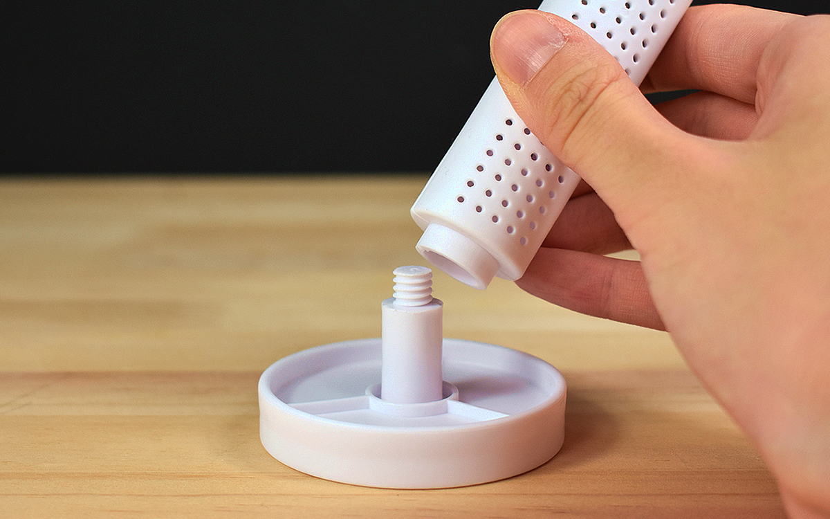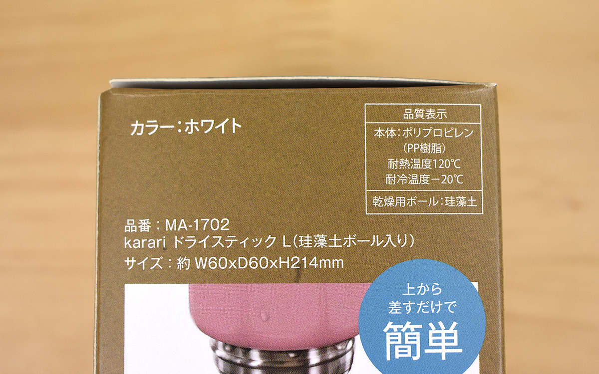 同商品はSサイズとLサイズが展開されていて、今回は約60(幅)×60(奥行)×214mm(高さ)のLサイズを購入。丸い水受けスペースとスティックのシンプルな組み合わせのデザインで、本体を振ると中で何かがカシャカシャと細かい音を立てました。実は本体内に入っているのは、吸湿性に優れた珪藻土の“乾燥用ボール”。珪藻土入りといっても重量は70gと軽く、扱いにくさはまったく感じません。