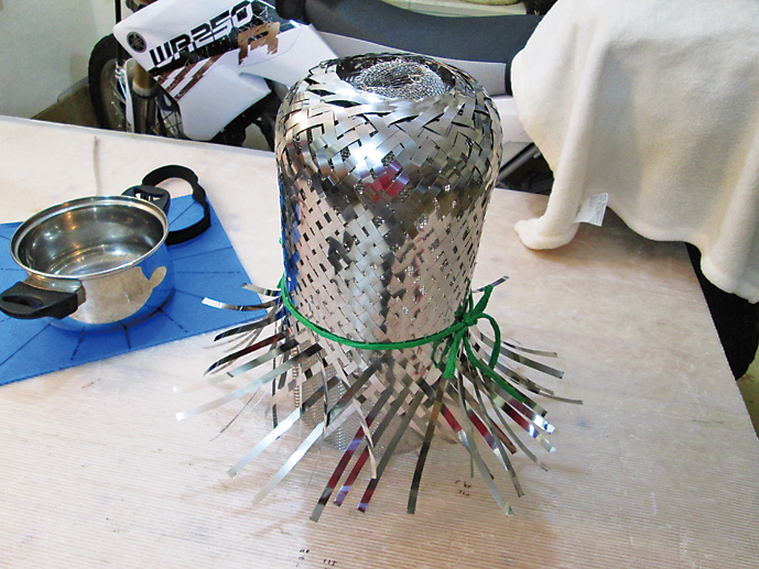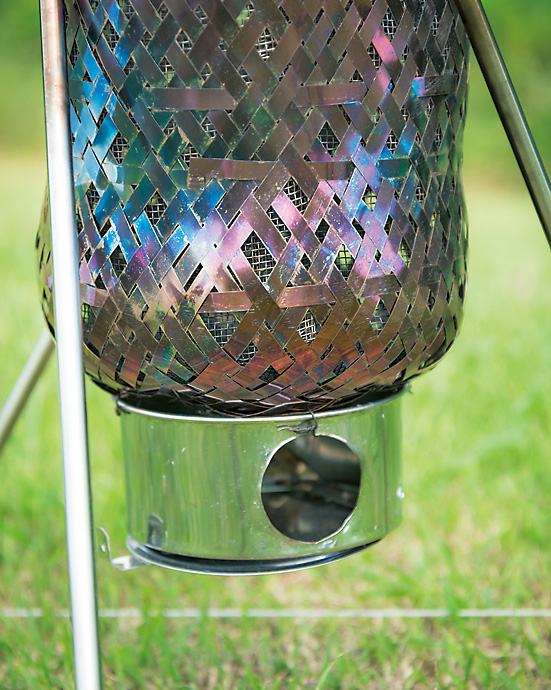 0.1mm厚のステンレス板を5mm幅に割き、「三角網代編み」で製作した唯一無二の焚き火台。デザインは西川さんの竹細工の先生の作品をアレンジ。竹と比べるとステンレスは滑りやすかったのでガムテープで固定しながら編み、最後は銅線を巻き付けて縁を仕上げた。西川さんの竹細工の編み技が存分に発揮された作品だ。