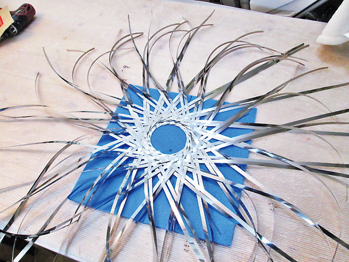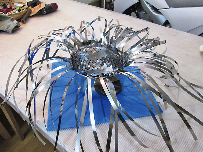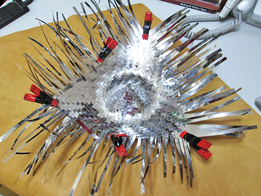 「輪弧編み(りんこあみ)」中の写真。0.1mm厚のステンレス板を幅7×長さ910mmにカットして編んだ