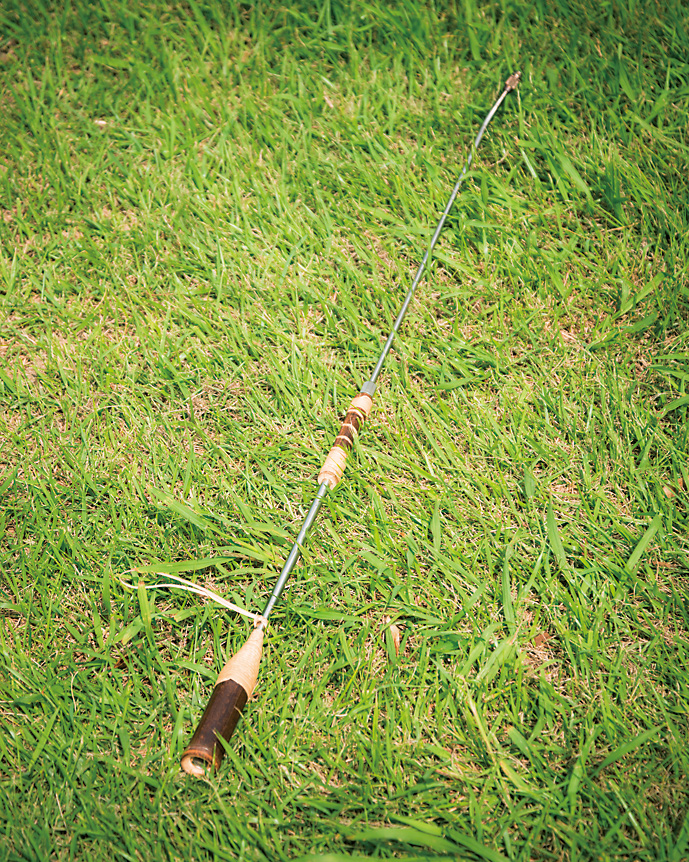ピンポイントで空気を送るのに便利なファイヤーブラスター(火吹き棒)も手作り。竹筒での製作経験はあったが、伸縮可能なものが欲しかったため噴霧器のパイプに着目。先端ノズルを交換し、持ち手には黒竹を装着した。製作費はなんと約2000円!