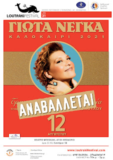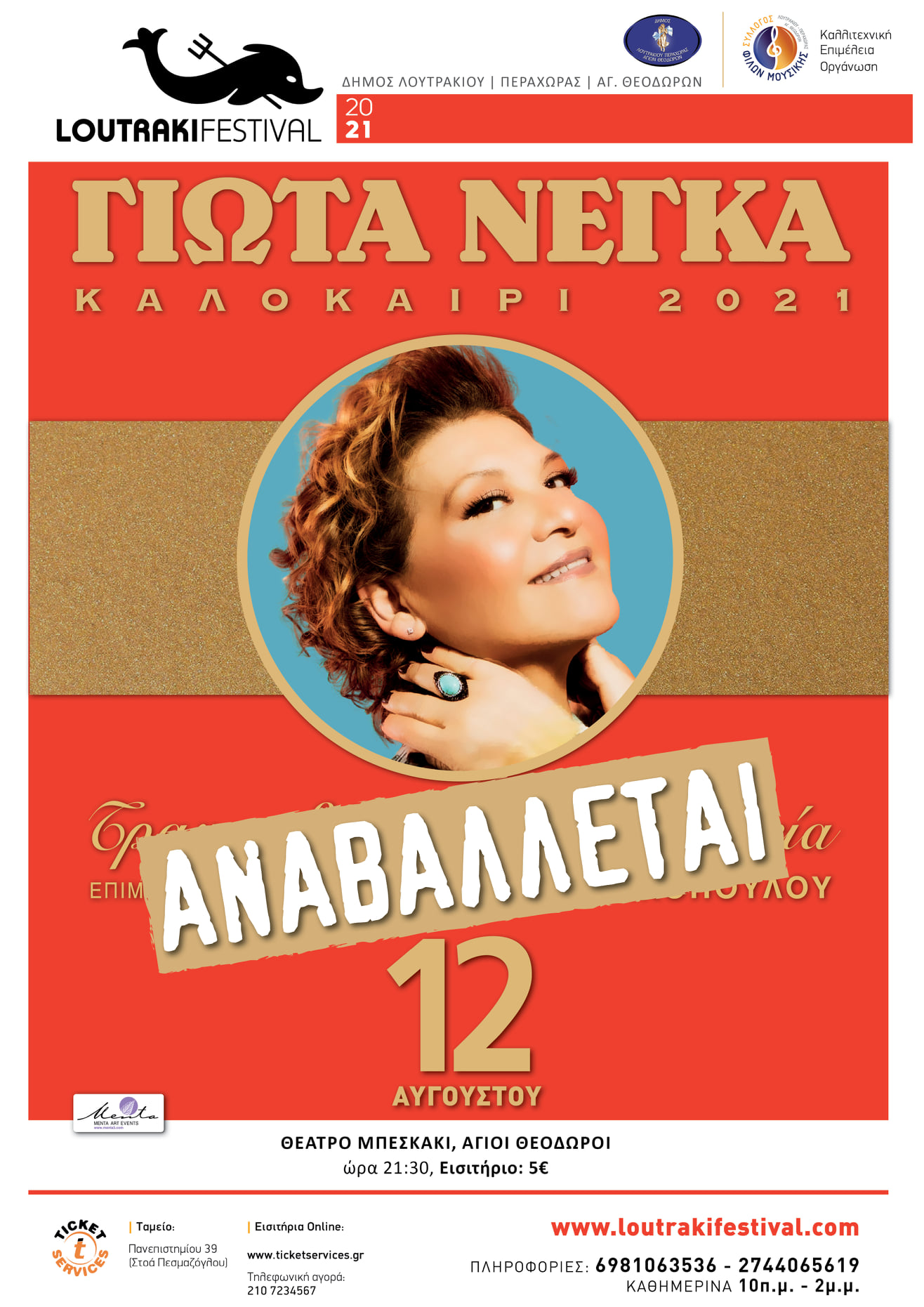 Σας ενημερώνουμε ότι η Συναυλία με τη Γιώτα Νέγκα που ήταν προγραμματισμένη για αύριο Πέμπτη 12 Αυγούστου 2021 στο Θέατρο «Νότης Περιγιάλης» των Αγίων Θεοδώρων ΑΝΑΒΑΛΛΕΤΑΙ.