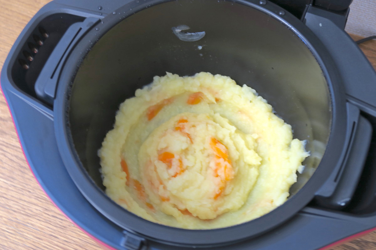 新モデルだからこそスムーズにできるようになったのが、ポテトサラダ作り。従来モデルでは食材を茹でることはできたものの、食材をつぶすのはマッシャーなどを使って自分で行う必要がありました。しかし、新モデルでは食材の加熱からつぶす工程まで、すべて全自動でできるんです。