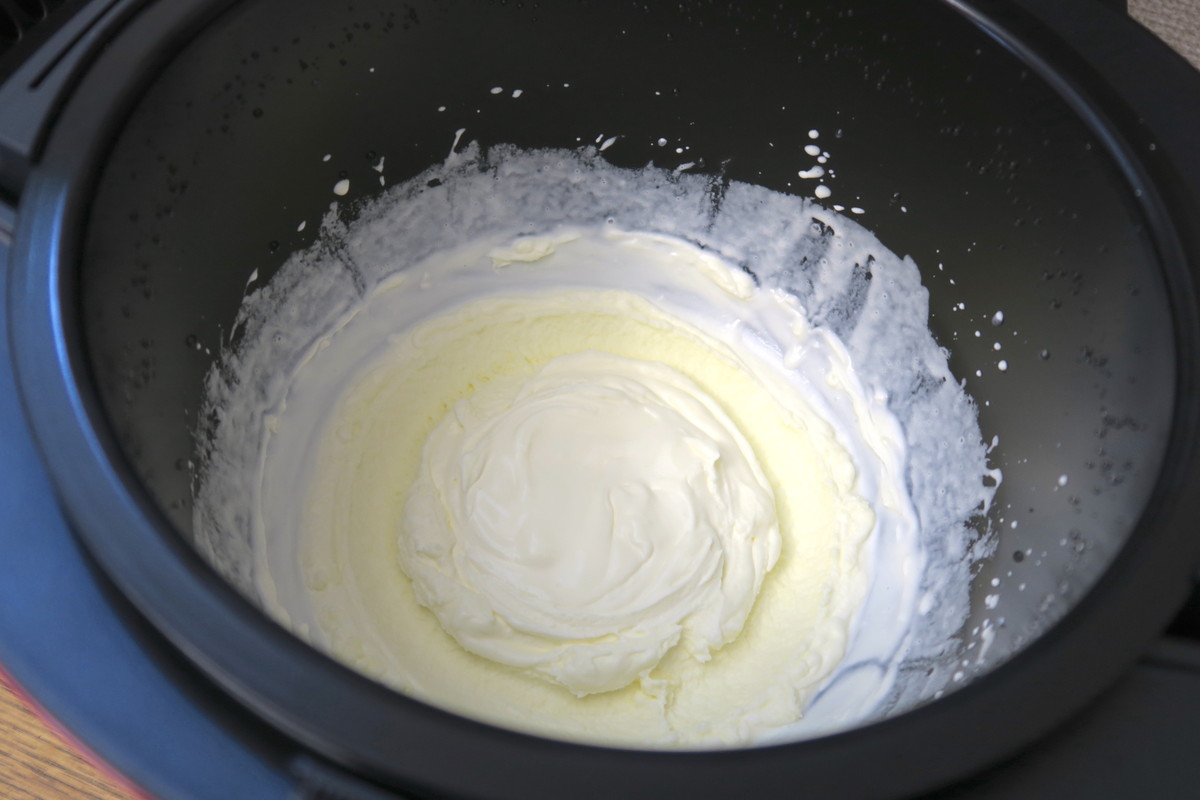 これまでは自動調理の工程としてのまぜ技機能の進化を紹介しましたが、「泡立て」に使えるようになったのも新モデルの特筆すべきポイントです。たとえば、生クリームと砂糖を入れて自動調理メニューで調理すれば、ホイップクリームが完成します。