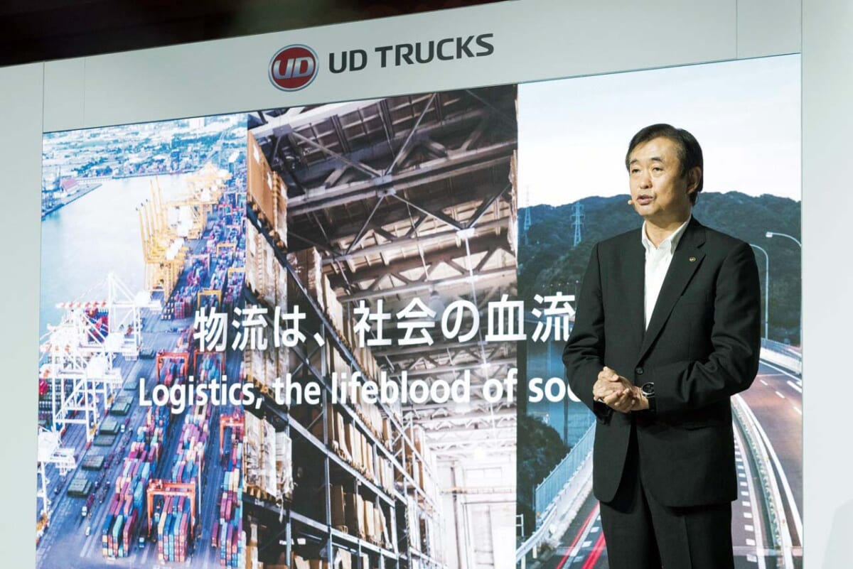 記者発表会に登壇したUDトラックス 代表取締役社長 酒巻孝光氏は、「ここ数年、ドライバーの有効求人倍率は全業種平均の約2倍と圧倒的に高く、その要因は少子高齢化、若者のクルマ離れ、給料、長時間労働や荷役作業のような体力的に過酷な労働環境など様々なことが考えられますが、UDトラックスができることはドライバーに常に寄り添ってその解決方法を常に考えること。我々は運ぶことをもっと楽に、そして豊かな気持ちで運んでもらえるよう、今後も技術力でサポートしていきたい」と語りました。
