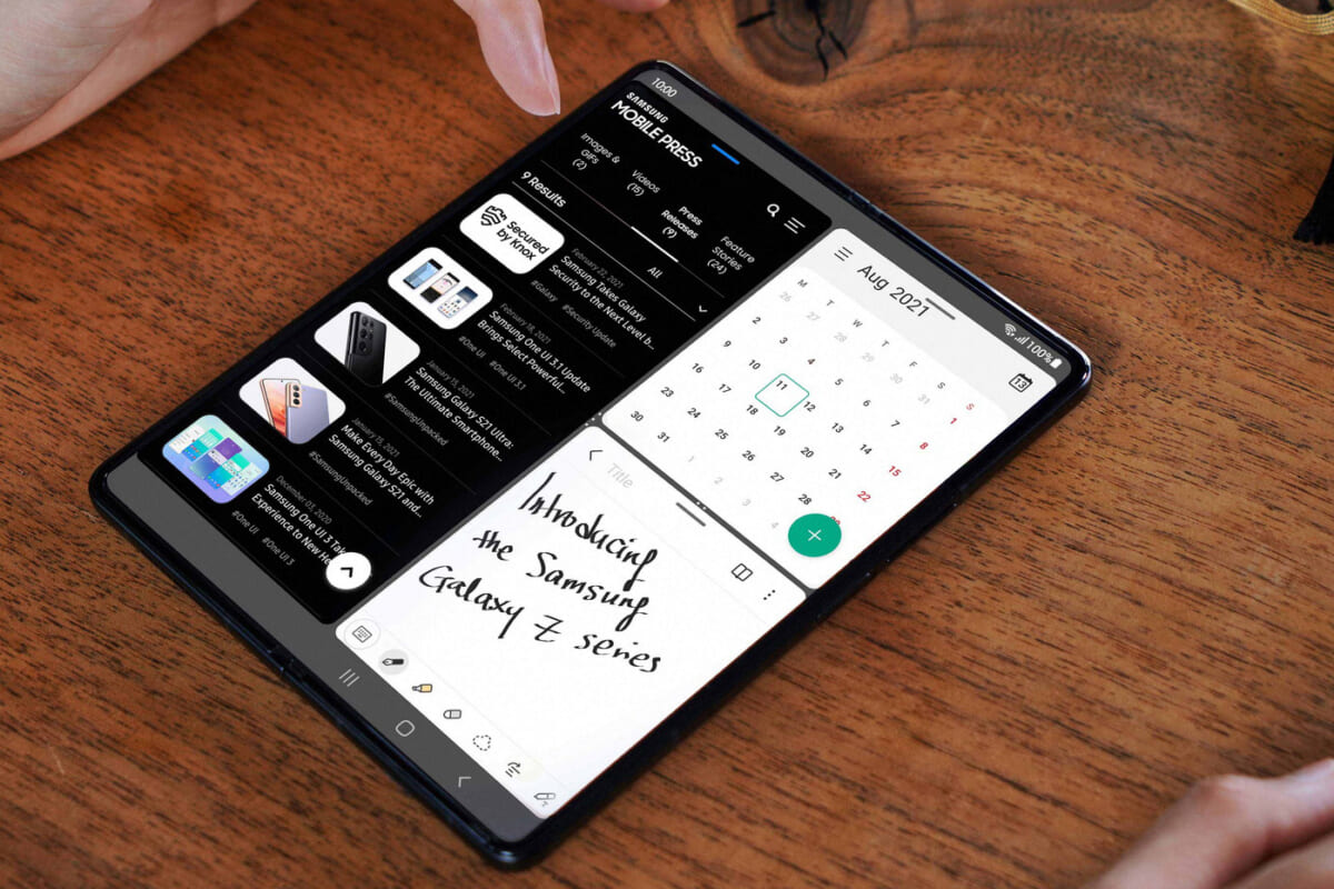 Galaxy Z Fold3 5Gのメイン画面では、マルチタスク機能で3つのアプリを同時に起動することが可能。2つの縦長のアプリを並べて使うこともできます。