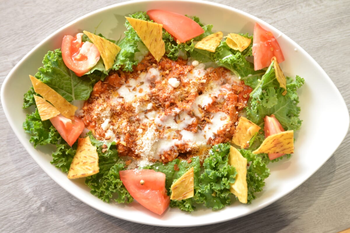 「本場沖縄のタコライスよりもスパイシーに仕上げました。タイのチリソース・シラチャ―のほか、クミンやコリアンダーなどのスパイスも使っています。さらに乾燥スパイスを仕上げにかけることで、より香りと食感にアクセントを加えました。サイドにあしらったケールの苦みも、一緒にお楽しみください」(小林さん)