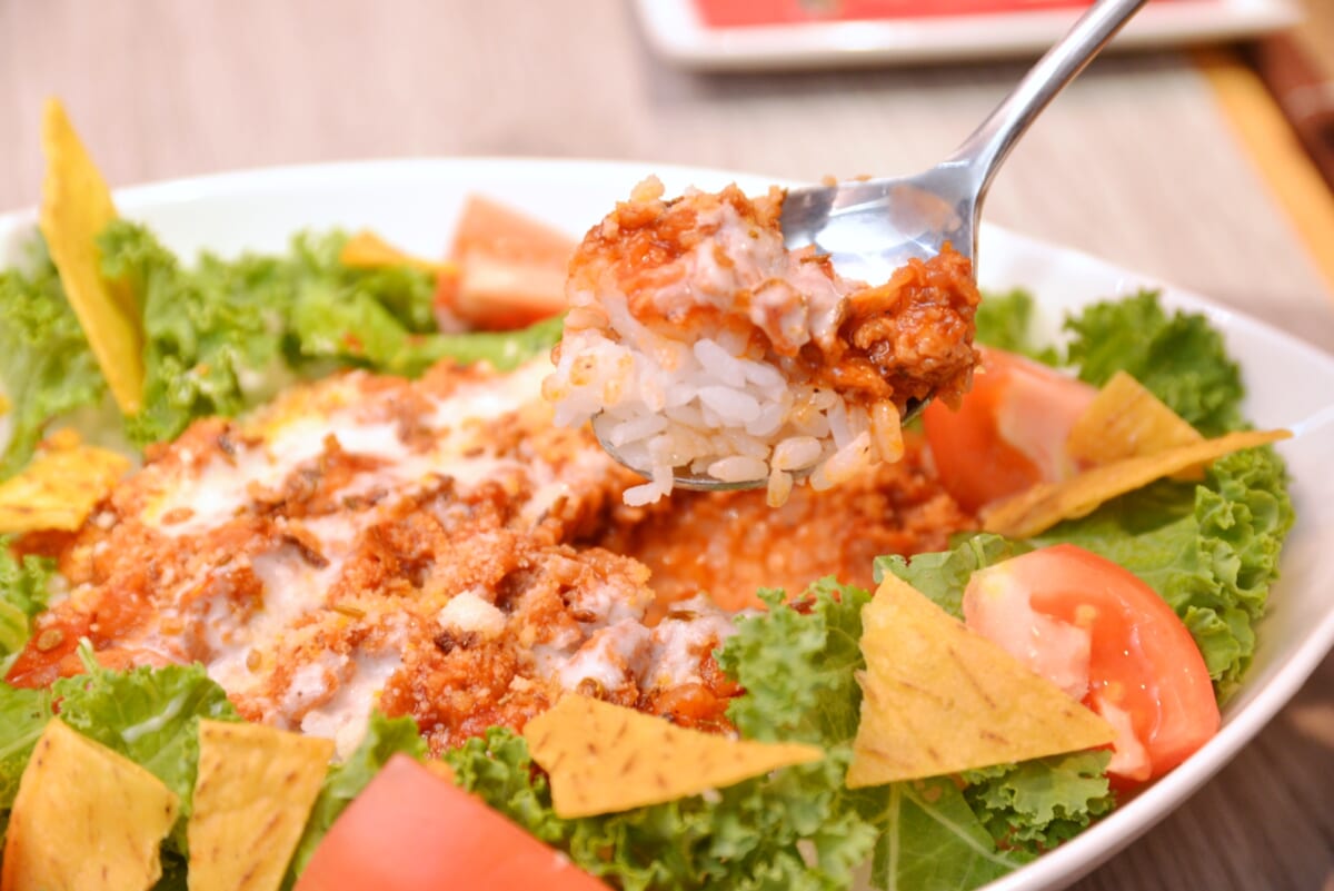「自家製さくさくメンチカツ」は、ソースなしでそのまま食べても絶品でした。これは塩やこしょうのほかにブイヨンも使ってうまみを底上げしているからだと小林料理長。次は「自家製スパイシータコライス」について聞きました。