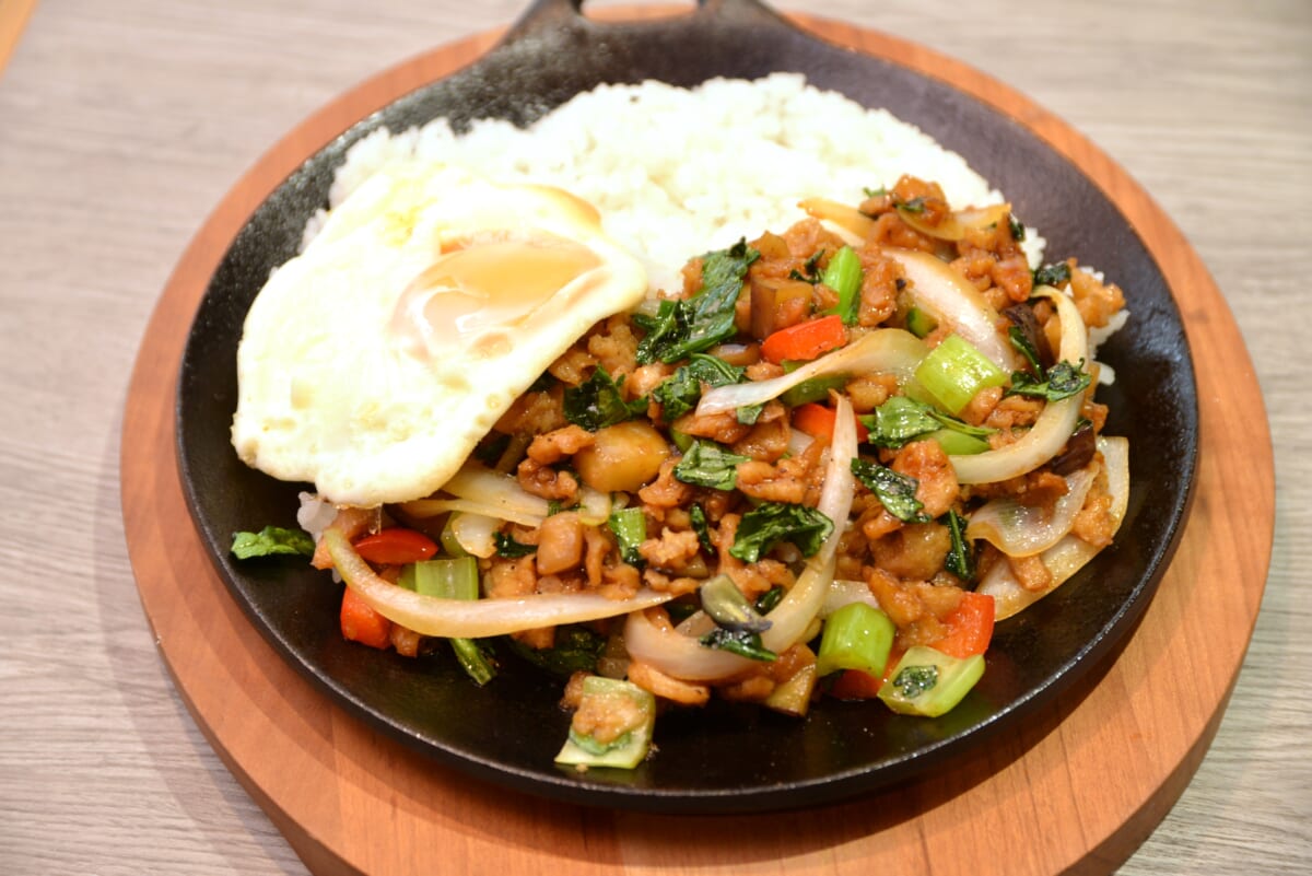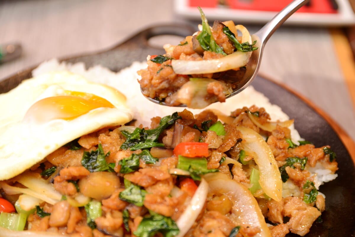 「ベースの『ミラクルミート』は水でふくらませるのですが、その加減はどうするか、さらに味の染み込ませ方や粘りの出し方まで、何度も試作し研究しました。調理工程でも違いが出ます。例えば『自家製スパイシータコライス』は『ミラクルミート』をよく搾ったうえで、水分を飛ばすように炒めることで香ばしい食感に。一方で『自家製ガパオ』は、注文が入ってから炒めて野菜の香りをまとわせ、ソースを加えて炒め煮るような手法です。この工夫により、しっとりとした食感に仕上げることができました」(小林さん)