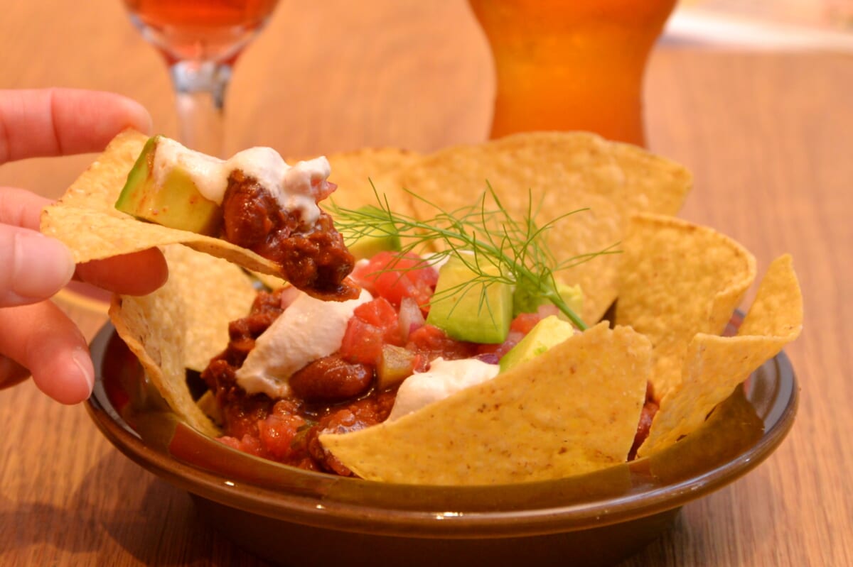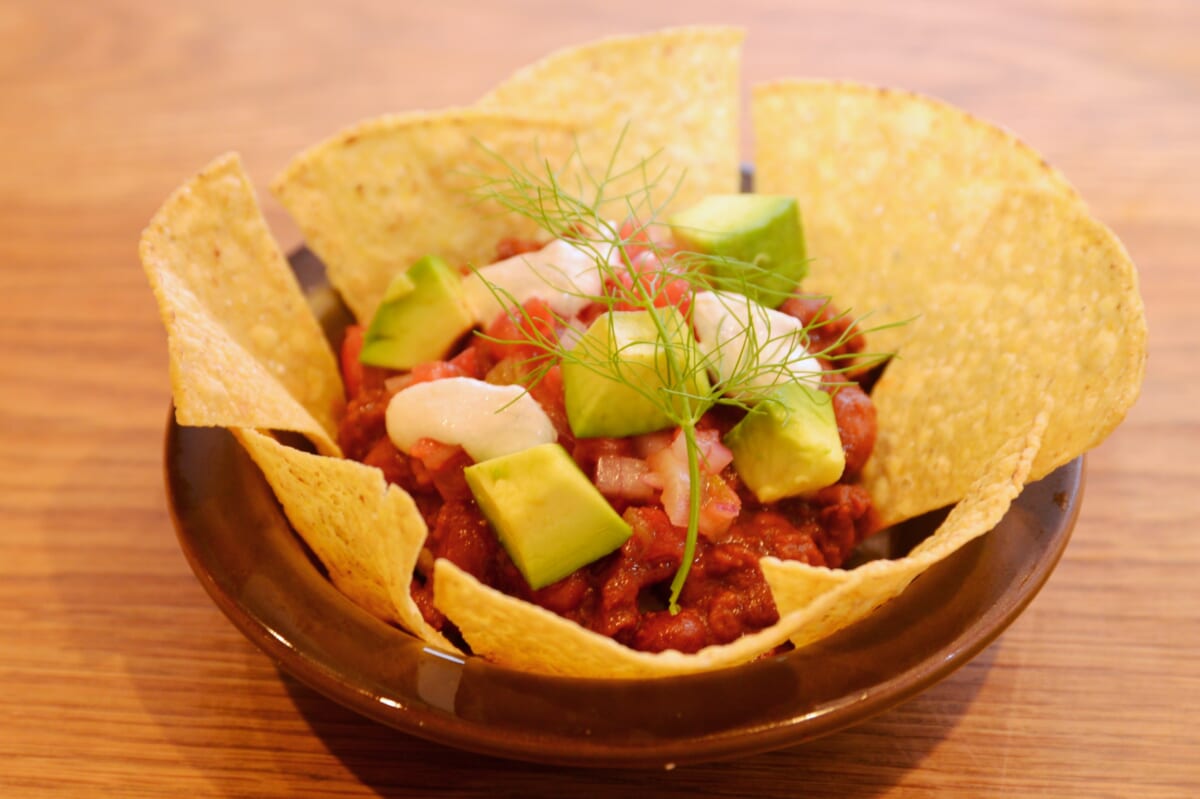 「ヴィーガンナチョス」は、「ミラクルミート」を使った自家製チリビーンズと、トルティーヤチップスの組み合わせにアボカドをオン。チリビーンズは、ランチで人気の「SVBチリービーンズバーガ―」(1300円)の味付けをヒントに、「ミラクルミート」版で再構成したのだとか。