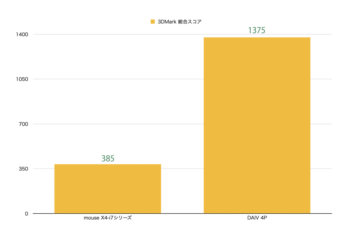 なお、もうひとつ参考として、3D描画性能を計測するベンチマークソフト「3D Mark」によるテストも実施してみました。その結果はmouse X4-i7シリーズの総合スコアが385だったのに対し、DAIV 4Pでは1375という結果になりました。より詳細に見れば、mouse X4-i7はグラフィックススコアが336、CPUスコアが2312で、DAIV 4Pはグラフィックススコアが1227、CPUスコアが4350です。DAIV 4Pは、mouse X4-i7に比べて、3D描画性能において、明らかな強みを持っていることがわかります。