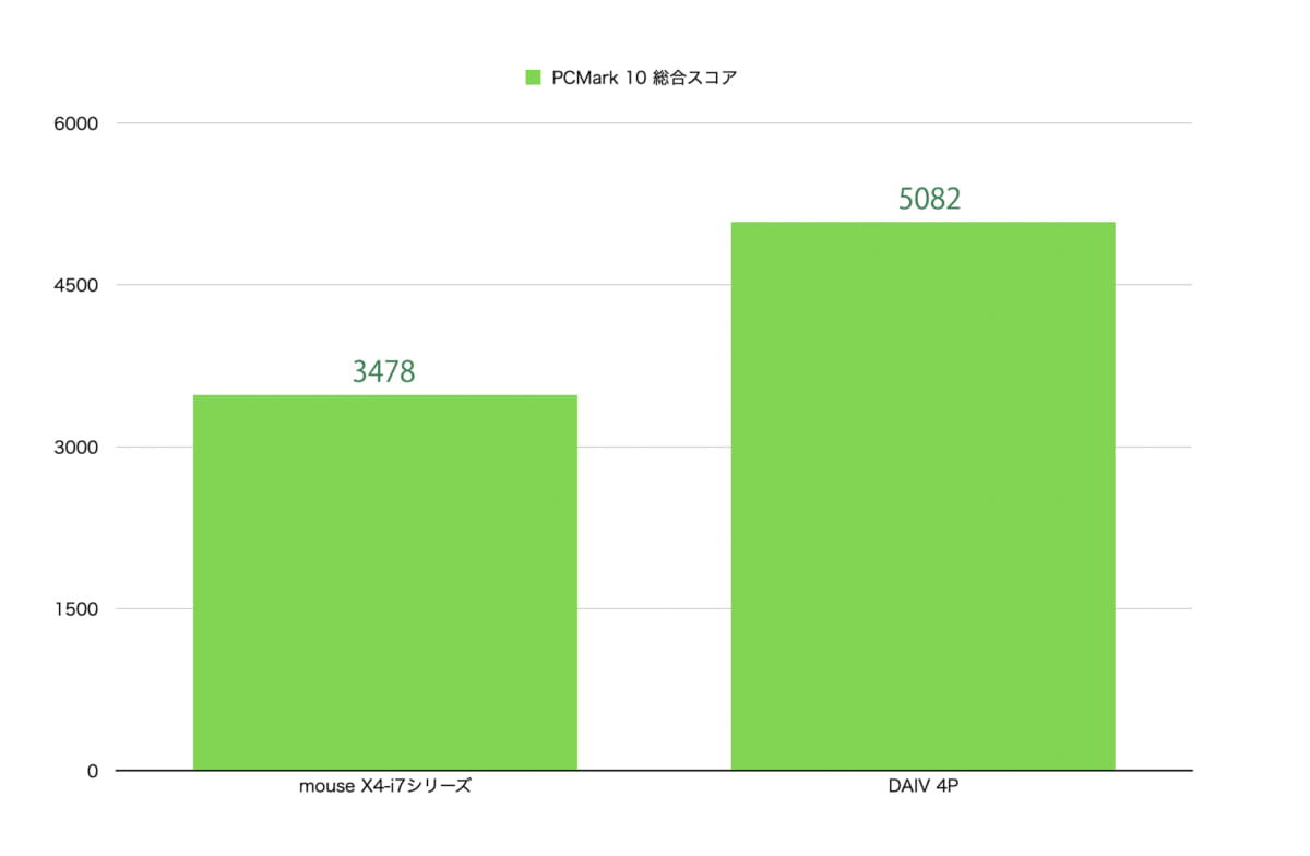 PCMark 10では、mouse X4-i7の総合スコア3478だったのに対し、DAIV 4Pでは5082という結果が出ました。特に大きな差が出たのは写真の表示速度を測る「Photo Score」と描画性能を測る「Rendering and Visualization Score」、そして映像の処理性能を測る「Digital Content Creation」です。mouse X4-i7シリーズがそれぞれ3272、1639、2599というスコアだったのに対し、DAIV 4Pでは7792、3465、5121と、圧倒的な差をつけています。このことから、映像の描画に関する性能において、全体的にインテル Iris Xe グラフィックスの搭載が関わっており、結果的に、ノートPCそのものの処理性能に差をつける結果になっていると言えるでしょう。