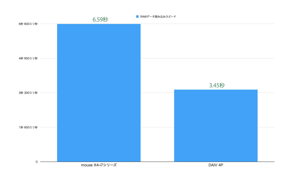 また参考までに、Photoshop CCにRAWデータを読み込ませて、データが開くまでの時間を測ってみましたが、27.7MのDNGフォーマットのデータを開くまでの時間は、mouse X4-i7シリーズが6.59秒だったのに対し、DAIV 4Pでは3.45秒という結果になりました。こちらでもDAIV 4Pの処理性能の高さを感じられます。