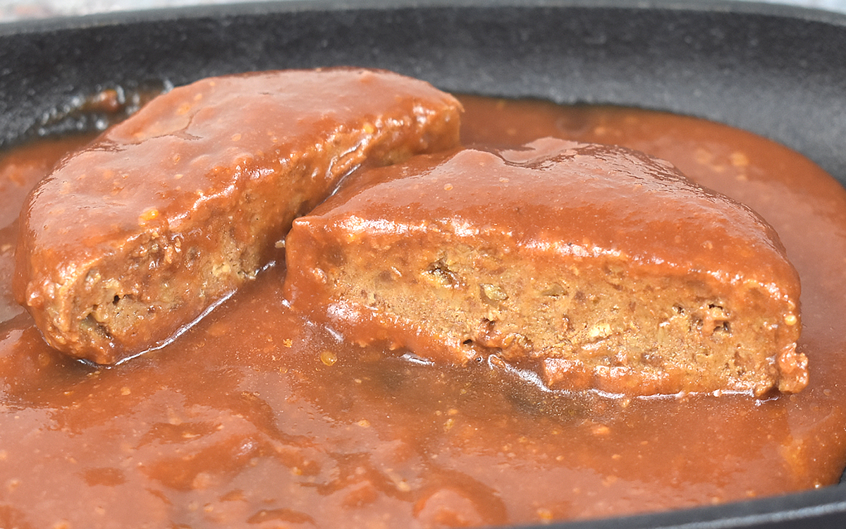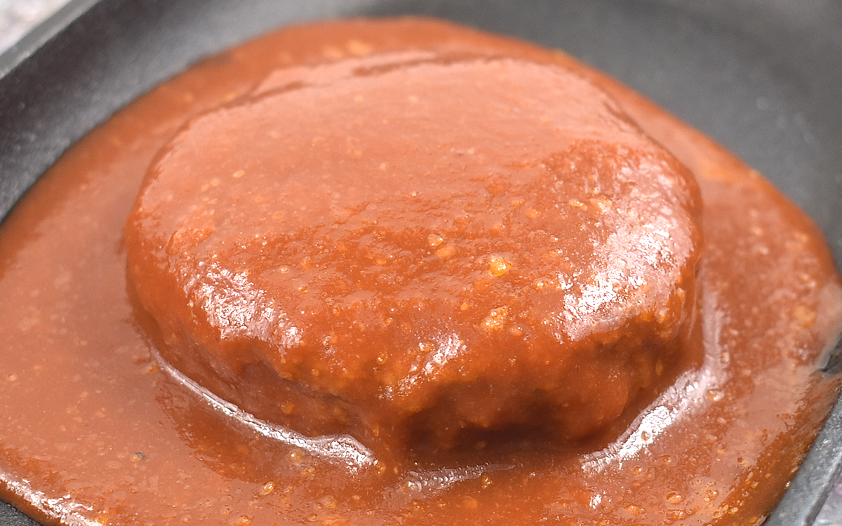 「肉バル缶」の最大のポイントは、調理したハンバーグをそのまま缶詰にしているところ。長く保管できるのはもちろん、レトルト食品なのにもかかわらず“粗びきの肉感”をしっかりと残しています。それでは、実際に同商品を味わってみましょう。