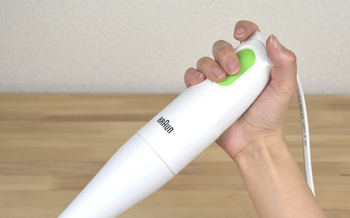 セッティングを終えてなお565gと軽く、寸法も75(幅)×75(奥行)×340mm(高さ)のスリムボディ。本体を手にするとちょうど指先にスイッチがあり、握った瞬間から電源を入れることができます。2枚の鋭い刃が備わっているため、カップの外側で電源を入れてしまわないよう注意してください。