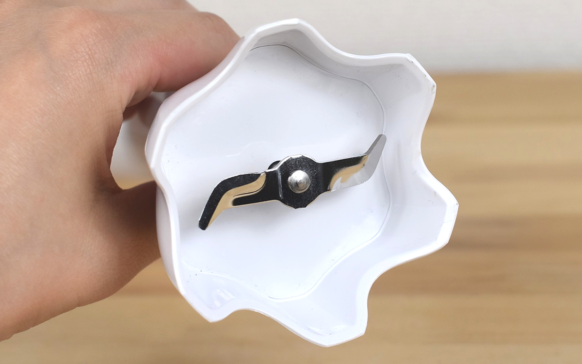 本体・ブレンダーシャフト・専用計量カップがセットになった同商品。セッティングは簡単で、ブレンダーシャフトを本体の溝に合わせて差しこみ反時計回りに回すだけ。最後にロックされる手応えを感じるので、ポロっと外れてしまう心配はありません。