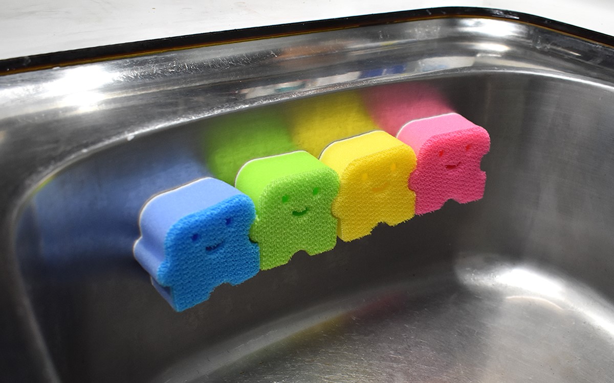 使い終わった後は、白い面を貼りつけるだけですっきり保管。複数のスポンジを並べて連結すると、まるで手を繋いでいるように見えますよね。使わない時も癒される、ユルくてキュートなデザインがたまりません。
