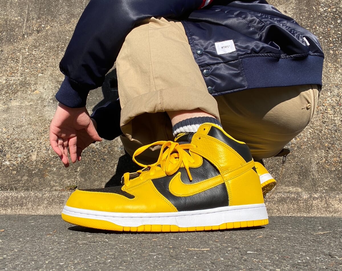 今回紹介するのは、今シーズン一番熱いと言われているシューズ「ナイキ ダンク」です! 初代モデルは1985年、アメリカでNBAと並んで高い人気を誇る「カレッジバスケットボールトーナメント」のチームカラーとして登場しました。日本では1990年代にミシガン大学のカラーである“紺×黄”のツートーンカラーが大ブレイク。その色使いから由来して通称“コンキ”ダンクとも呼ばれており、今でも絶大な人気を得ている名作です。当時小僧だった筆者にはとても手が出せる価格ではなかったので、東京・原宿と渋谷の中間くらいにあったショップ「トマホークチョップ」のショーウィンドウに飾られているのを、ただ眺めているだけでした(涙)。