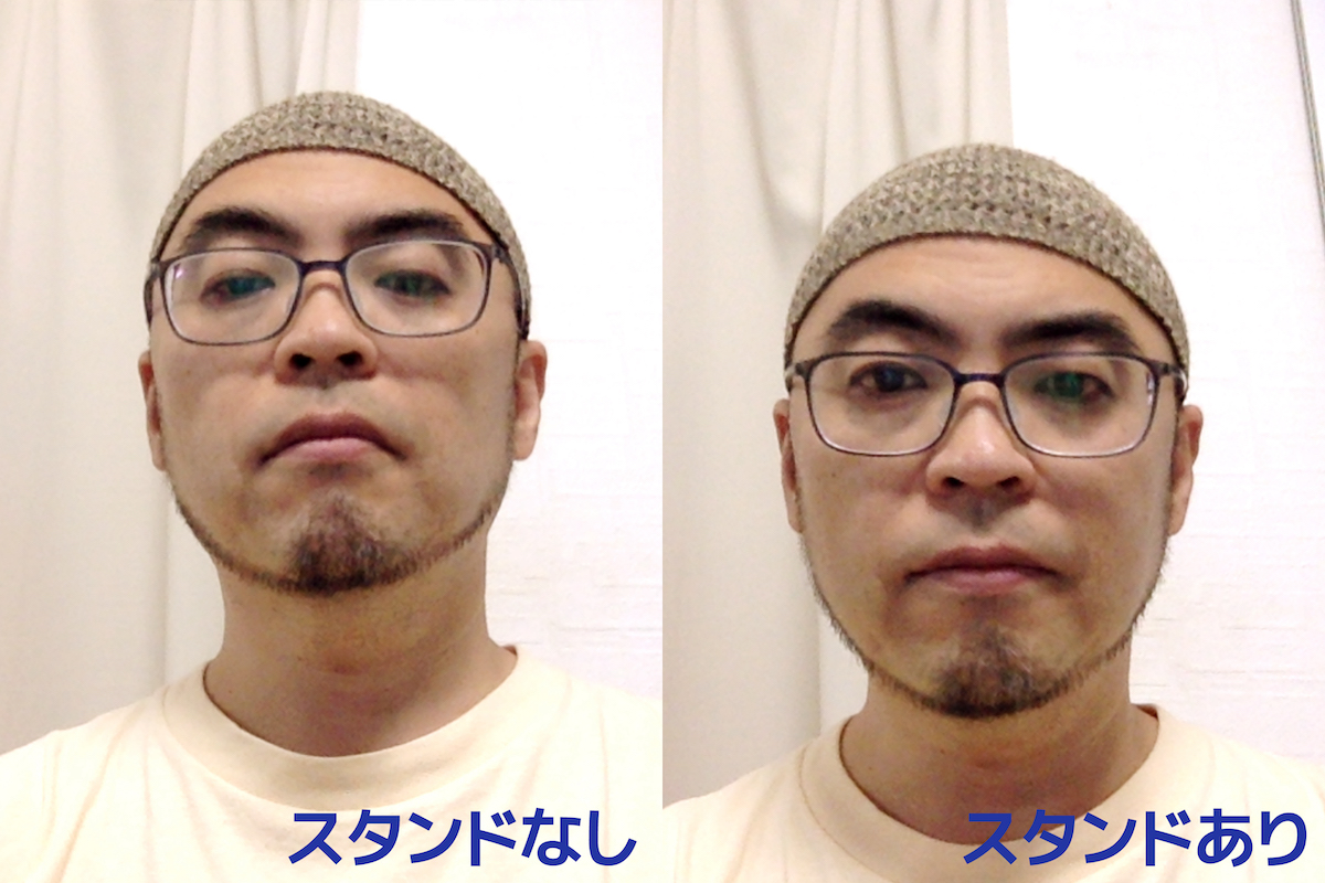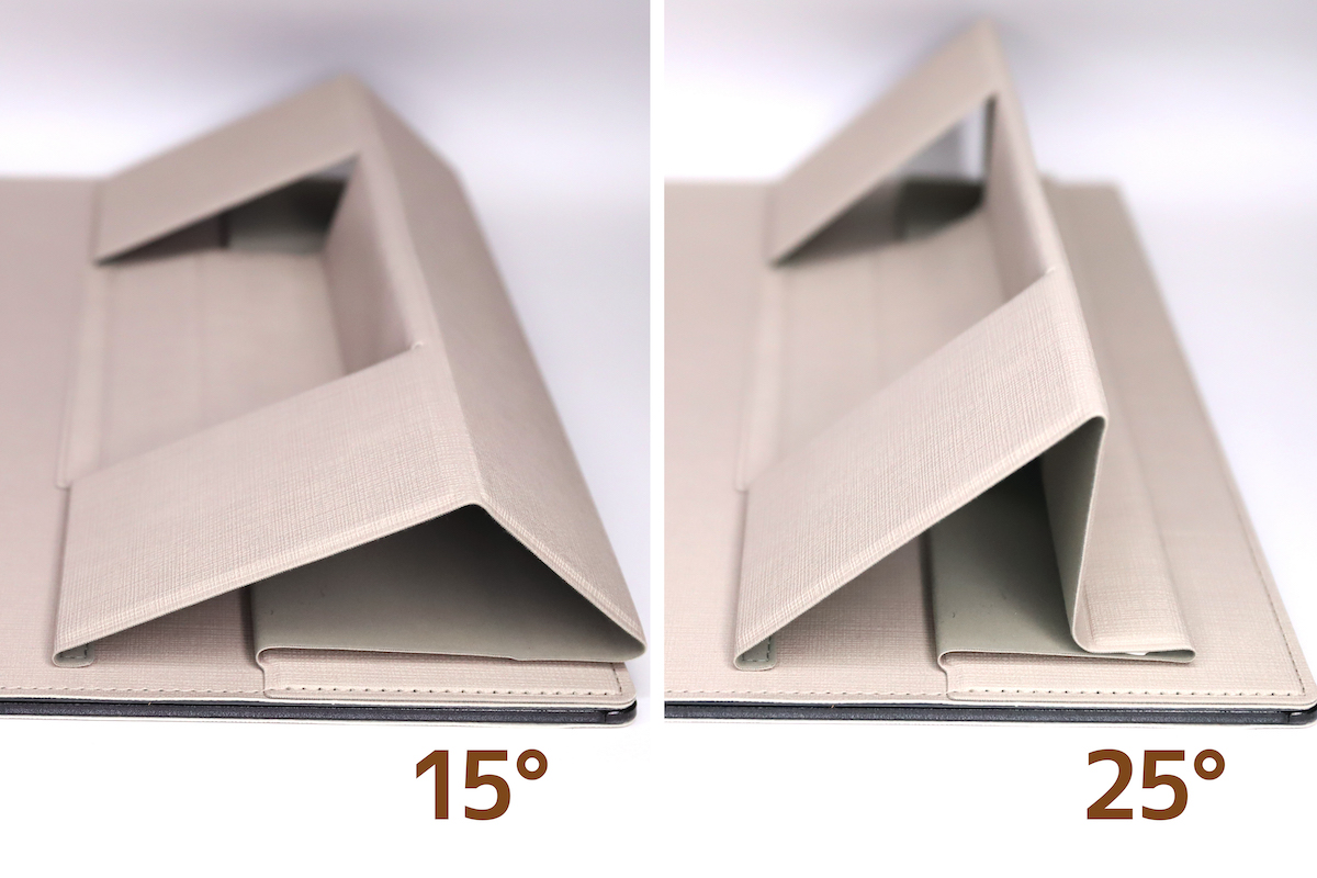 ただ、使ってみた感覚としては、スタンドとして使うには素材的な安定感がやや足りないかな、と感じることもあった。特に15度モードで使っていると、使用時に左右にグラグラと傾くことがあるのだ(25度だとだいぶ安定する)。これは、使いにくいと感じる人もいるかもしれない。