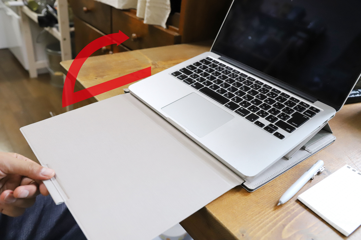 狭い机にPCを置いていると、ウェブ会議中にメモを取るだけの場所も取れない、なんてこともあるだろう。そういうときは、スタンド下端のタブをつまんで引くと、とフラットなボードが出てくる。これをパタンと折り返すと、ちょうどキーボードにフタをする形でボードが安定。